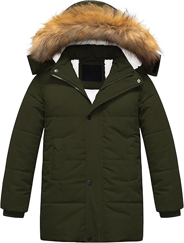 Boy's Sherpa Long Parka Winter Coat Thicken Water Repellent Puffer Jacket With Removable Faux Fur Hood